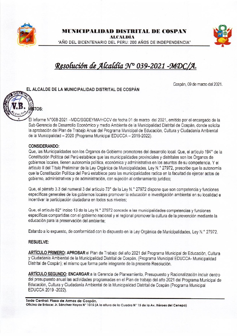 Resolución de Alcaldía Nº 039-2021-MDC-A - Municipalidad Distrital de Cospan - Cajamarca