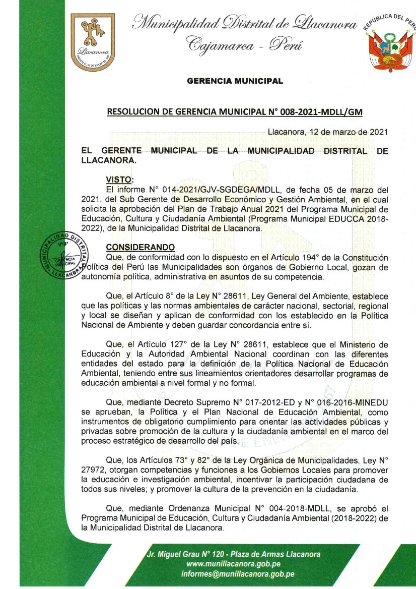 Resolución de Gerencia Municipal N° 008-2021-MDLL-GM - Municipalidad Distrital de Llacanora - Cajamarca
