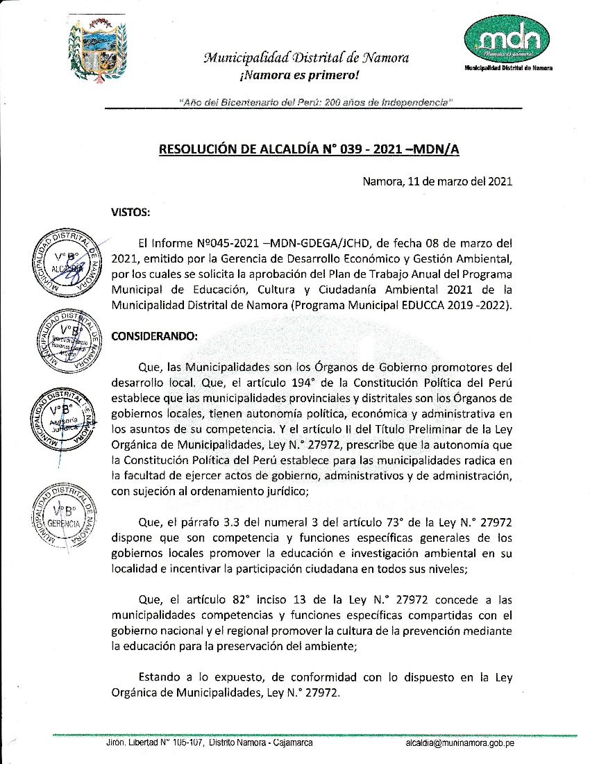 Resolución de Alcaldía Nº 039-2021-MDN-A - Municipalidad Distrital de Namora - Cajamarca
