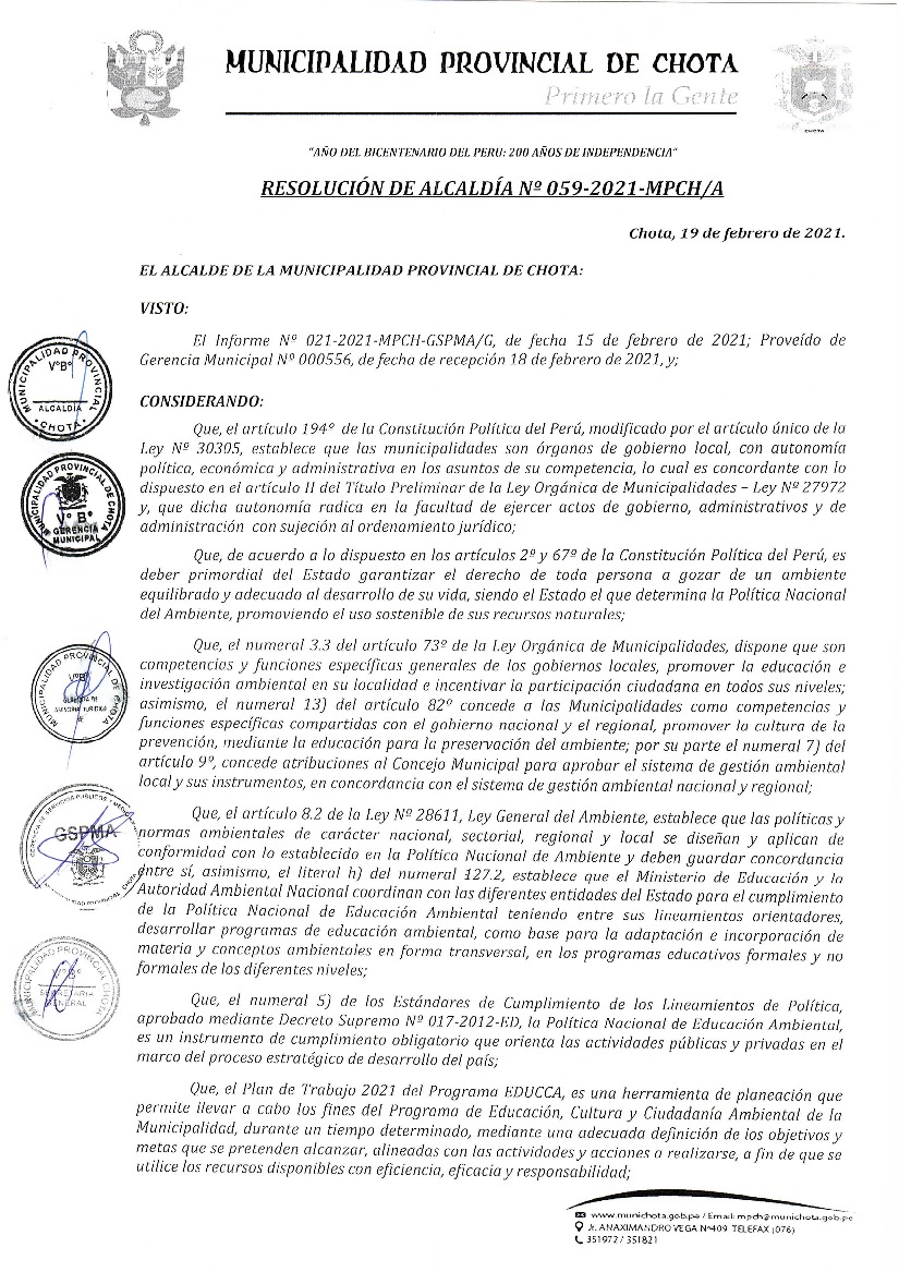 Resolución de Alcaldia N° 059-2021-MPCH-A - Plan de Trabajo EDUCCA Municipalidad Provincial de Chota
