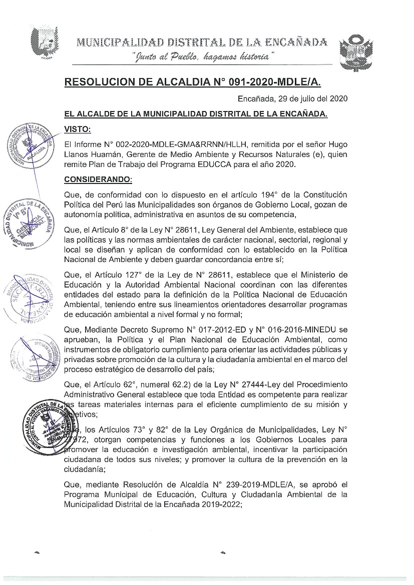 Resolución de Alcaldia N° 091-2020 MDLE-A - Municipalidad Distrital de La Encañada