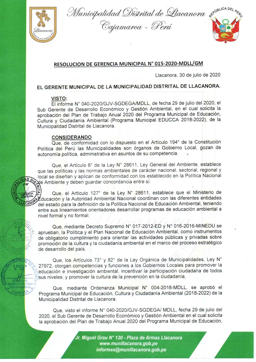 Resolución de Gerencia Municipal N°015-2020 MDLL- GM - Municipalidad Distrital de Llacanora