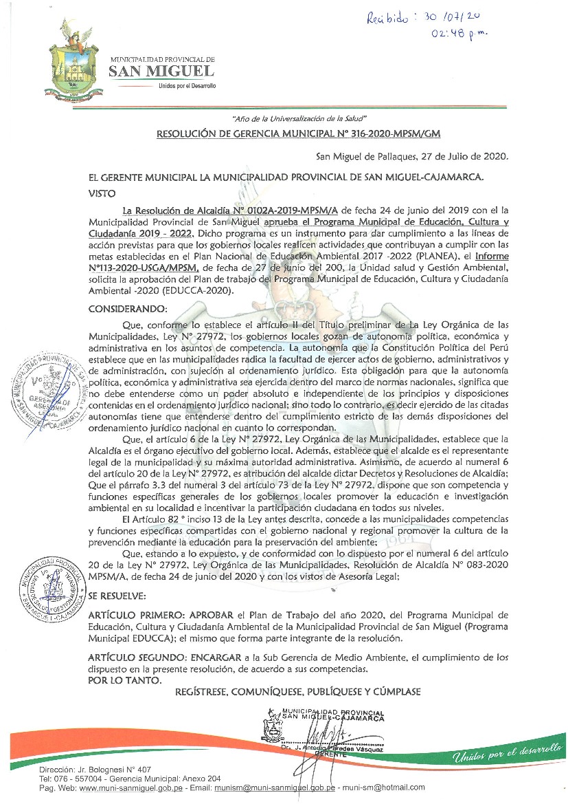 Resolución de Gerencia Muncipal N°316-2020-MPSM-GM - Municipalidad Provincial de San Miguel