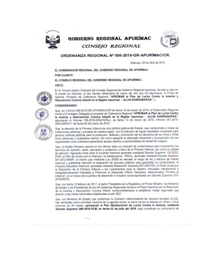 ARTICULO PRIMERO.- APROBAR el Plan de Lucha Contra la Anemia y Desnutrición Crónica Infantil en la Regional Apurímac ALLIN KAWSANAPAQ, con la finalidad de garantizar el desarrollo humano sostenible, con énfasis en la población infantil y gestante, como una prioridad de inversión pública, con inclusión y equidad social, a través del fortalecimiento de las acciones intersectoriales e intergubernamentales en el marco de la gestión territorial, para alcanzar los objetivos planteados al 2022, que en calidad de Anexo forma parte integrante de la presente Ordenanza Regional.