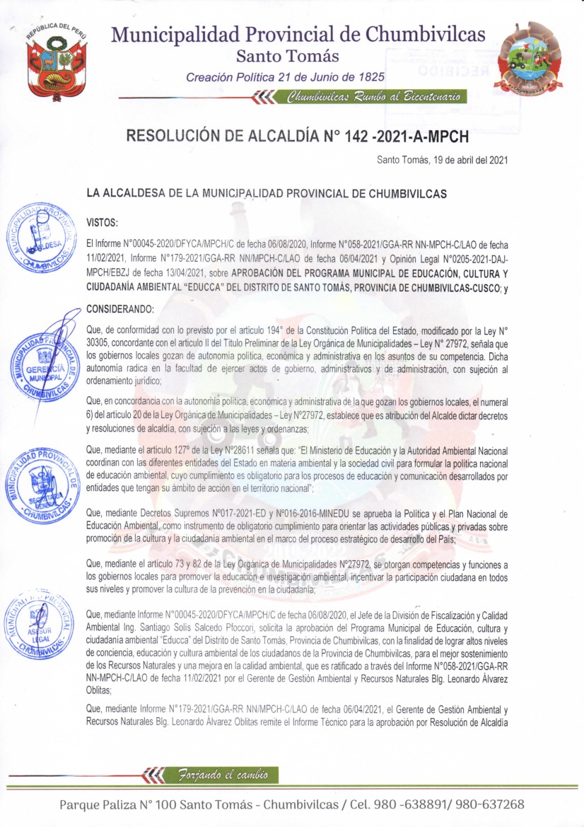 La presente Resolución aprueba el Programa Municipal de Educación, Cultura y Ciudadanía Ambiental de la Municipalidad Provincial de Chumbivilcas, para el periodo 2021-2022; con la finalidad de promover la cultura y la educación ambiental para la formación de ciudadanas y ciudadanos ambientalmente responsables e incentivar la participación ciudadana en todos sus niveles.
