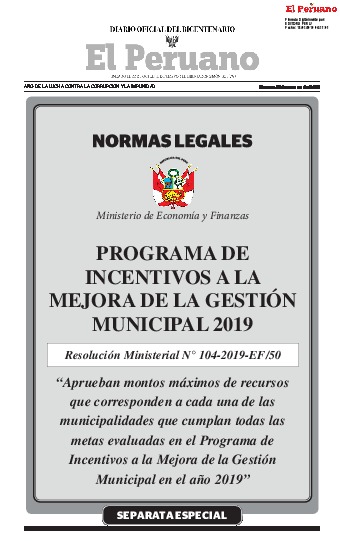 Mediante la RESOLUCIÓN MINISTERIAL 104-2019-EF/50. Aprueban montos máximos de recursos que corresponden a cada una de las municipalidades que cumplan todas las metas evaluadas en el Programa de Incentivos a la Mejora de la Gestión Municipal durante el año 2019.