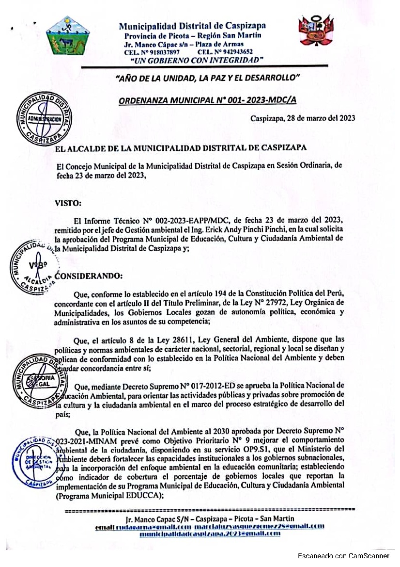 La presente Ordenanza aprueba el Programa Municipal de Educación, Cultura y Ciudadanía Ambiental de la Municipalidad Distrital de Caspizapa - Picota (San Martín); con la finalidad de promover la cultura y la educación ambiental para la formación de ciudadanas y ciudadanos ambientalmente responsables e incentivar la participación ciudadana en todos sus niveles.
