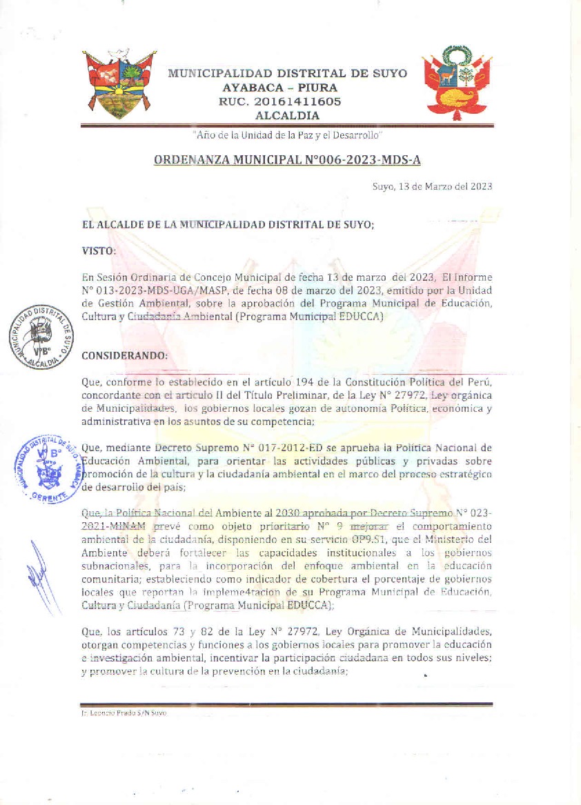 La presente Ordenanza aprueba el Programa Municipal de Educación, Cultura y Ciudadanía Ambiental de la Municipalidad Distrital de Suyo - Ayabaca (Piura); con la finalidad de promover la cultura y la educación ambiental para la formación de ciudadanas y ciudadanos ambientalmente responsables e incentivar la participación ciudadana en todos sus niveles.