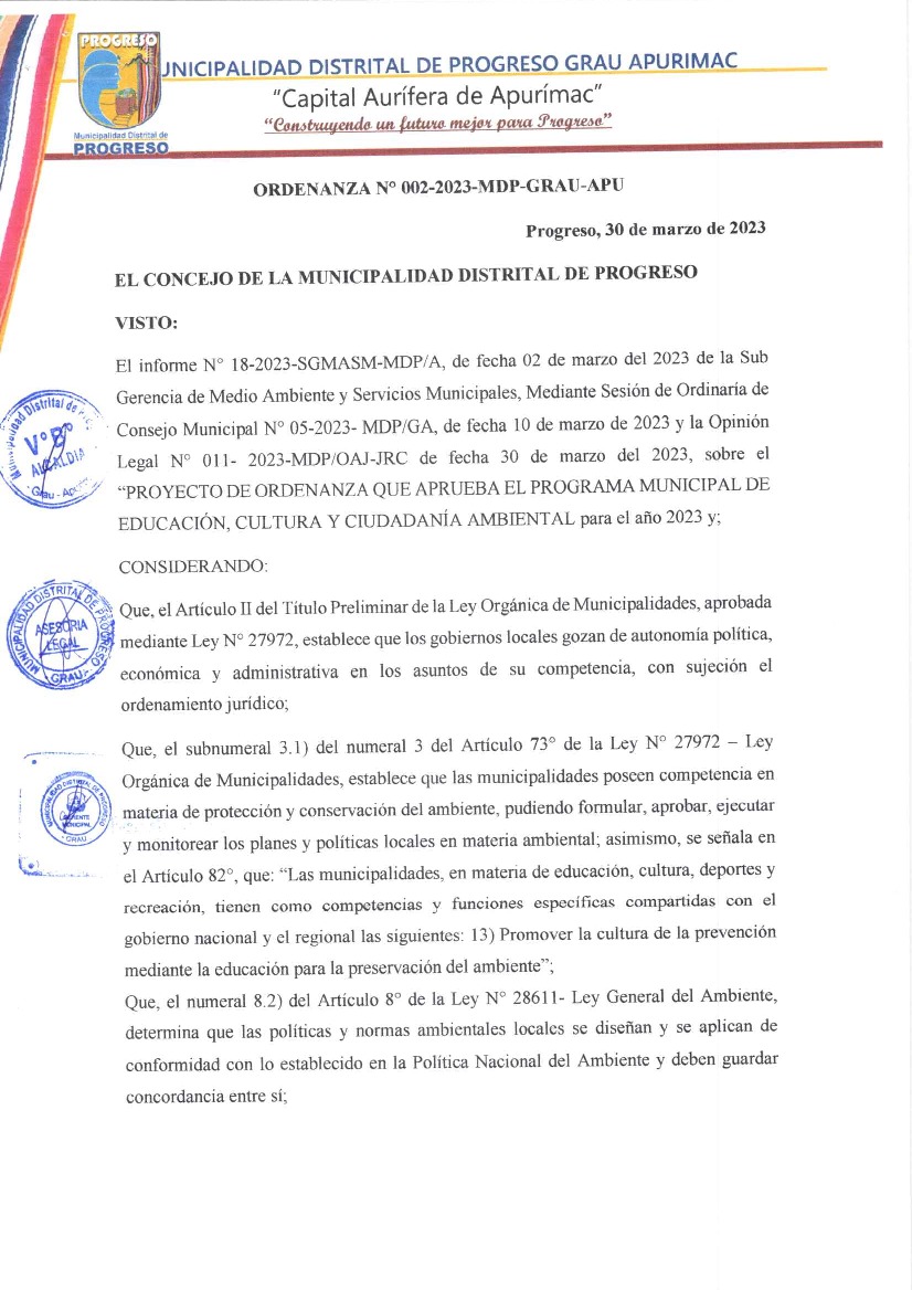 La presente Ordenanza aprueba el Programa Municipal de Educación, Cultura y Ciudadanía Ambiental de la Municipalidad Distrital de Progreso, provincia de Grau, región Apurímac, con la finalidad de promover la cultura y la educación ambiental para la formación de ciudadanas y ciudadanos ambientalmente responsables, e incentivar la participación ciudadana en la gestión ambiental.