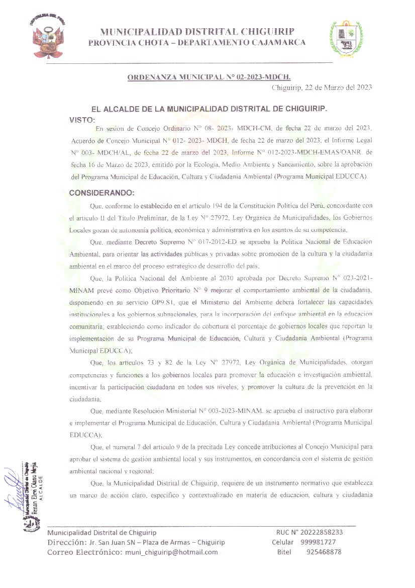 La presente Ordenanza aprueba el Programa Municipal de Educación, Cultura y Ciudadanía Ambiental de la Municipalidad Distrital de Chiguirip - Chota (Cajamarca); con la finalidad de promover la cultura y la educación ambiental para la formación de ciudadanas y ciudadanos ambientalmente responsables e incentivar la participación ciudadana en todos sus niveles.