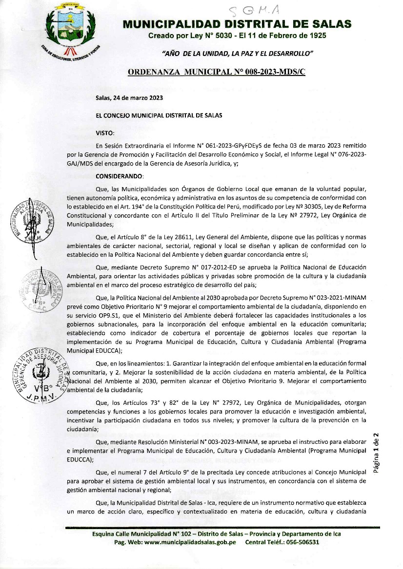 La presente Ordenanza aprueba el Programa Municipal de Educación, Cultura y Ciudadanía Ambiental de la Municipalidad Distrital de Salas - Ica (Ica), con la finalidad de promover la cultura y la educación ambiental para la formación de ciudadanas y ciudadanos ambientalmente responsables e incentivar la participación ciudadana en todos sus niveles.