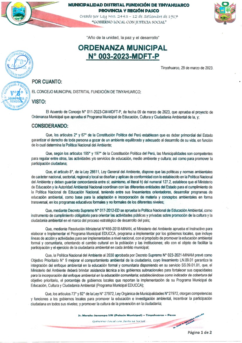 La presente Ordenanza Municipal aprueba el Programa Municipal de Educación, Cultura y Ciudadanía Ambiental de la Municipalidad Distrital de Fundición de Tinyahuarco, con la finalidad de promover la cultura y la educación ambiental para la formación de ciudadanas y ciudadanos ambientalmente responsables e incentivar la participación ciudadana en todos sus niveles.