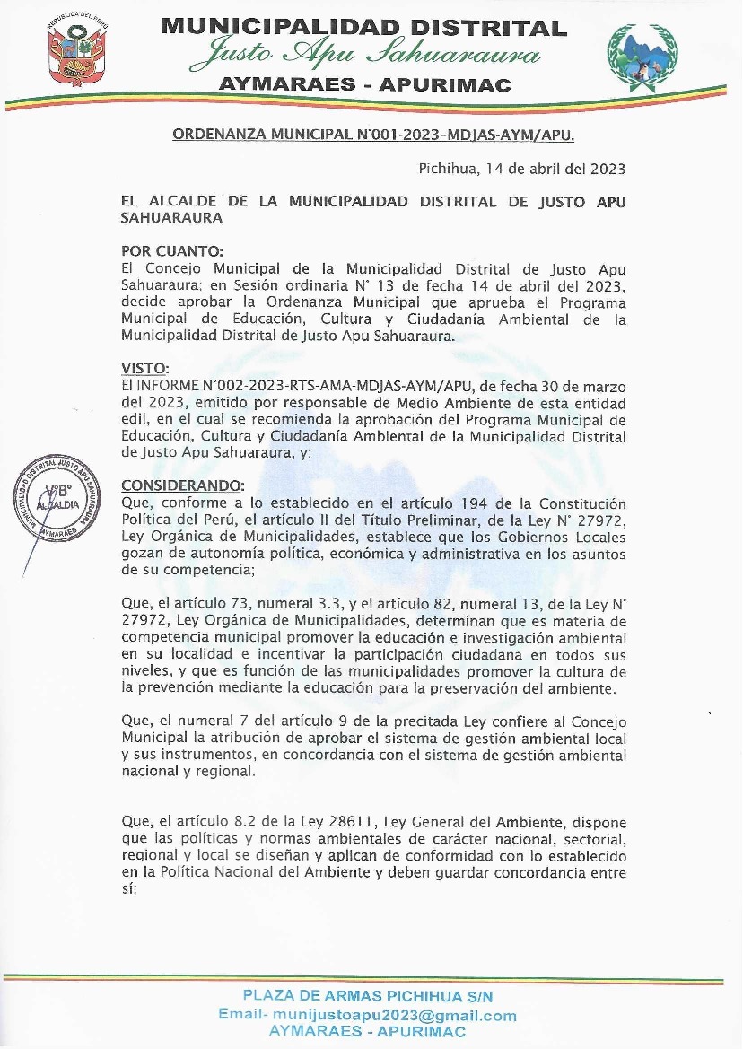Programa Municipal de Educación, Cultura y Ciudadanía Ambiental de la Municipalidad Distrital de Justo Apu Sahuaraura