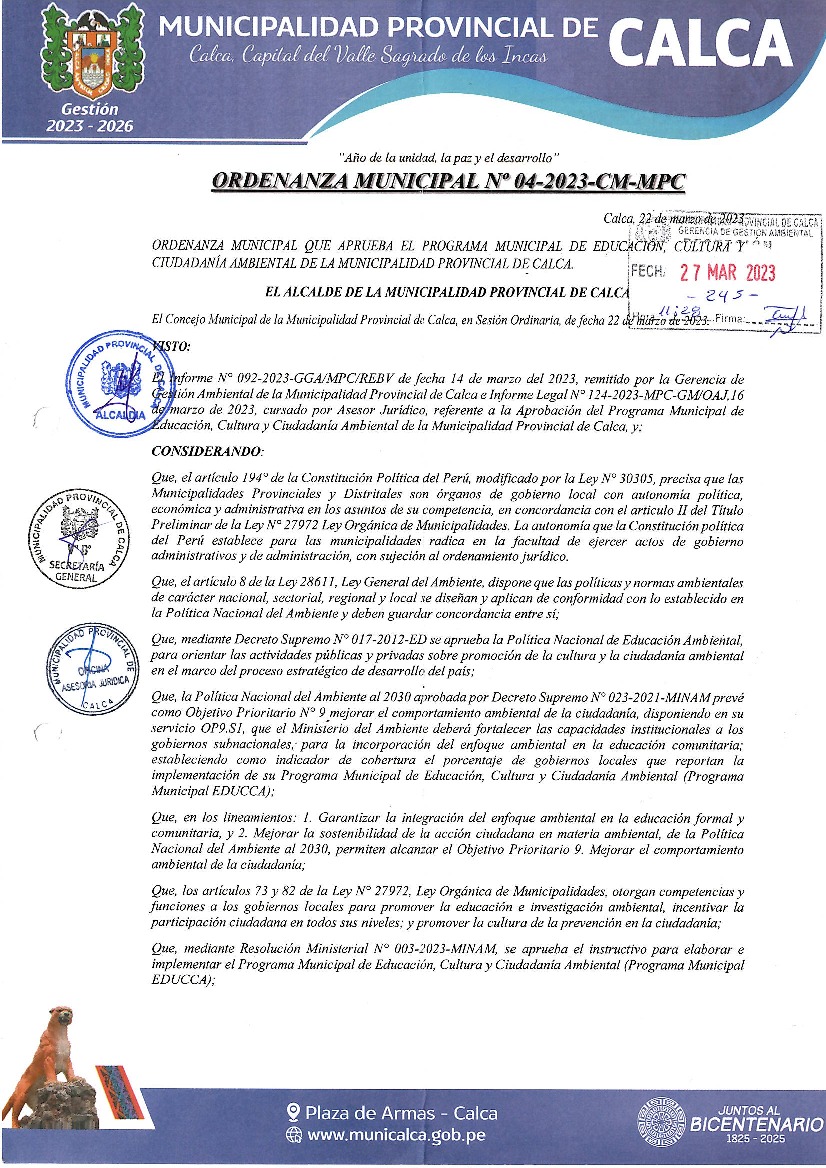 La presente ordenanza municipal aprueba el Programa Municipal de Educación, Cultura y Ciudadanía Ambiental de la Municipalidad Provincial de Calca (Cusco), con la finalidad de promover la cultura y la educación ambiental para la formación de ciudadanas y ciudadanos ambientalmente responsables e incentivar la participación ciudadana en todos sus niveles.