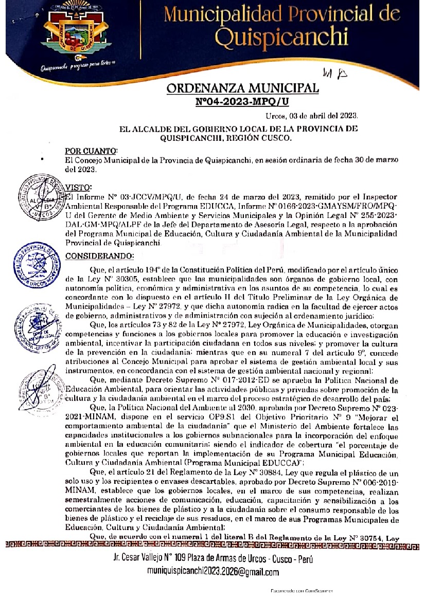 La presente ordenanza municipal aprueba el Programa Municipal de Educación, Cultura y Ciudadanía Ambiental de la Municipalidad Provincial de Quispicanchi (Cusco), con la finalidad de promover la cultura y la educación ambiental para la formación de ciudadanas y ciudadanos ambientalmente responsables e incentivar la participación ciudadana en todos sus niveles