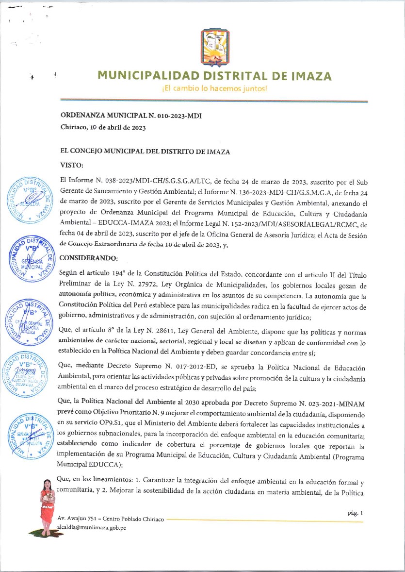 La presente Ordenanza aprueba el Programa Municipal de Educación, Cultura y Ciudadanía Ambiental de la Municipalidad Distrital de Imaza - Bagua (Amazonas), con la finalidad de promover la cultura y la educación ambiental para la formación de ciudadanas y ciudadanos ambientalmente responsables e incentivar la participación ciudadana en todos sus niveles.