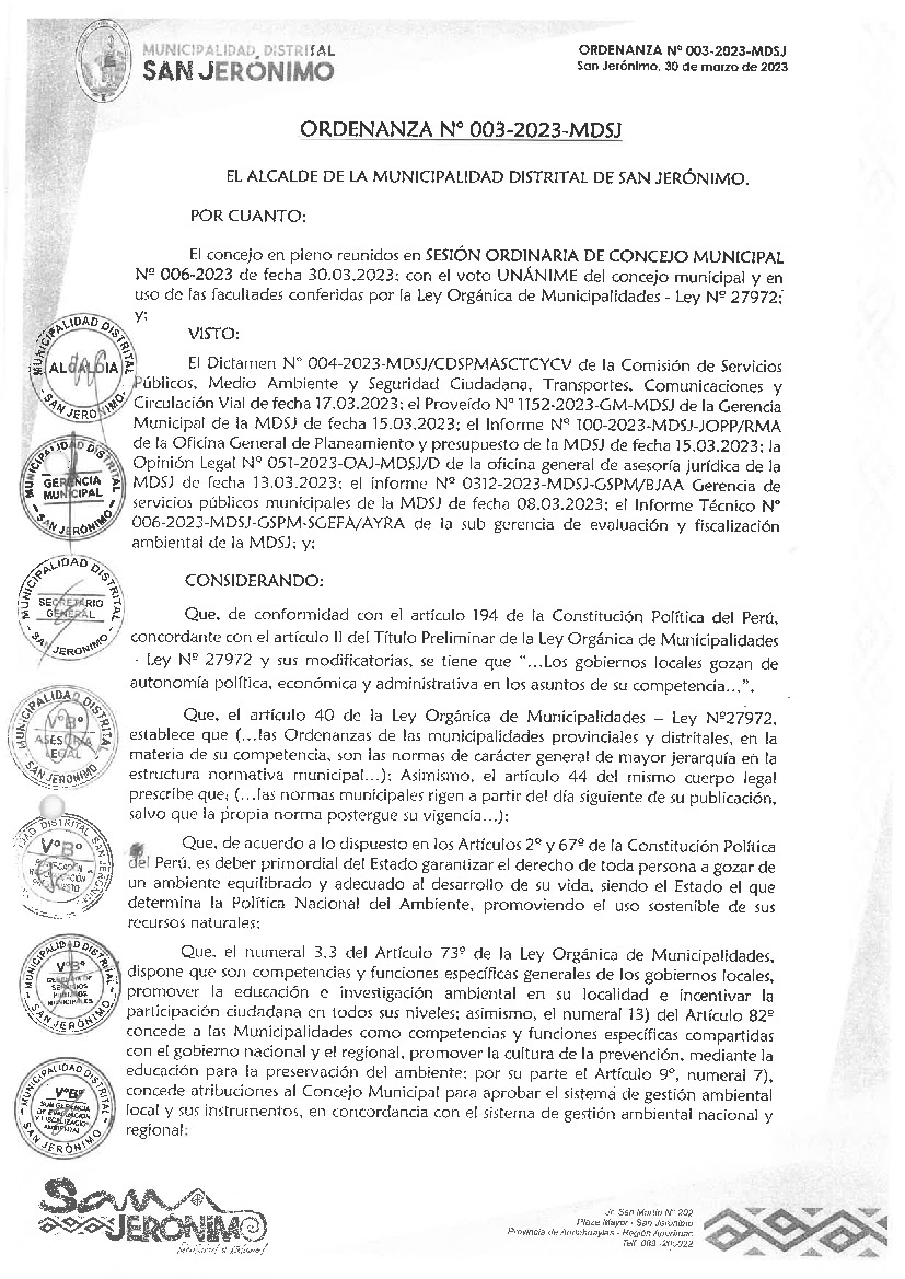 La presente Ordenanza aprueba el Programa Municipal de Educación, Cultura y Ciudadanía Ambiental de la Municipalidad Distrital de San Jerónimo, provincia de Andahuaylas, región Apurímac, con la finalidad de promover la cultura y la educación ambiental para la formación de ciudadanas y ciudadanos ambientalmente responsables, e incentivar la participación ciudadana en la gestión ambiental.