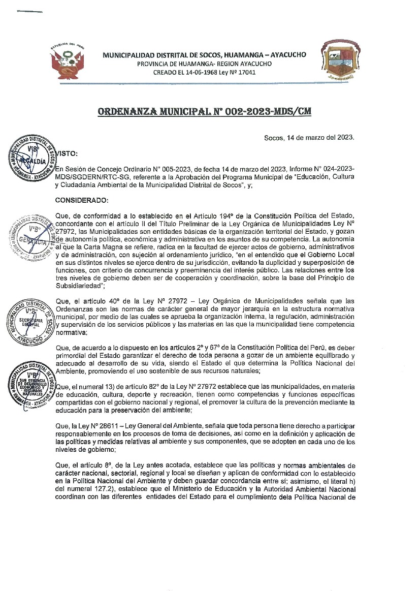 La presente Ordenanza aprueba el Programa Municipal de Educación Cultura y Ciudadanía Ambiental de la Municipalidad Distrital de Socos, Provincia de Huamanga (Ayacucho) con la finalidad de promover la cultura y la educación ambiental para la formación de ciudadanas y ciudadanos ambientalmente responsables e incentivar la participación ciudadana en todos sus niveles.
