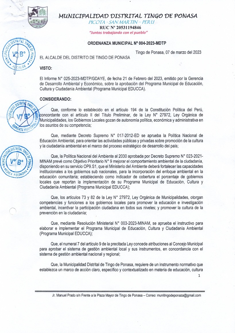 Programa Municipal de Educación, Cultura y Ciudadanía Ambiental de la Municipalidad Distrital de Tingo de Ponasa