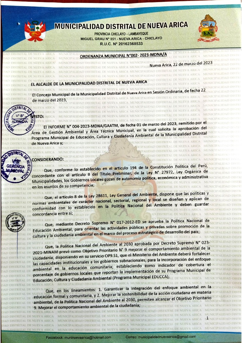 La presente Ordenanza aprueba el Programa Municipal de Educación, Cultura y Ciudadanía Ambiental de la Municipalidad Distrital de Nueva Arica - Chiclayo (Lambayeque); con la finalidad de promover la cultura y la educación ambiental para la formación de ciudadanas y ciudadanos ambientalmente responsables e incentivar la participación ciudadana en todos sus niveles.
