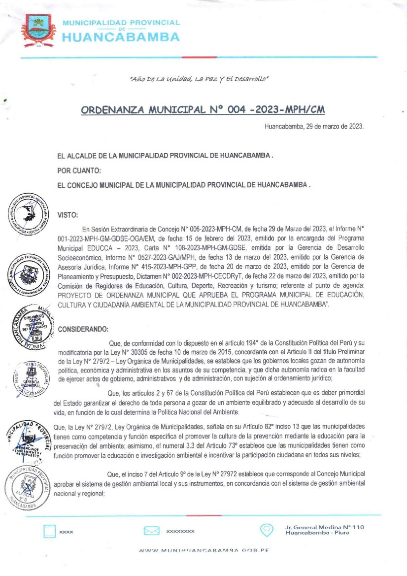 La presente Ordenanza aprueba el Programa Municipal de Educación, Cultura y Ciudadanía Ambiental de la Municipalidad Provincial de Huancabamba - Huancabamaba (Piura); con la finalidad de promover la cultura y la educación ambiental para la formación de ciudadanas y ciudadanos ambientalmente responsables e incentivar la participación ciudadana en todos sus niveles.