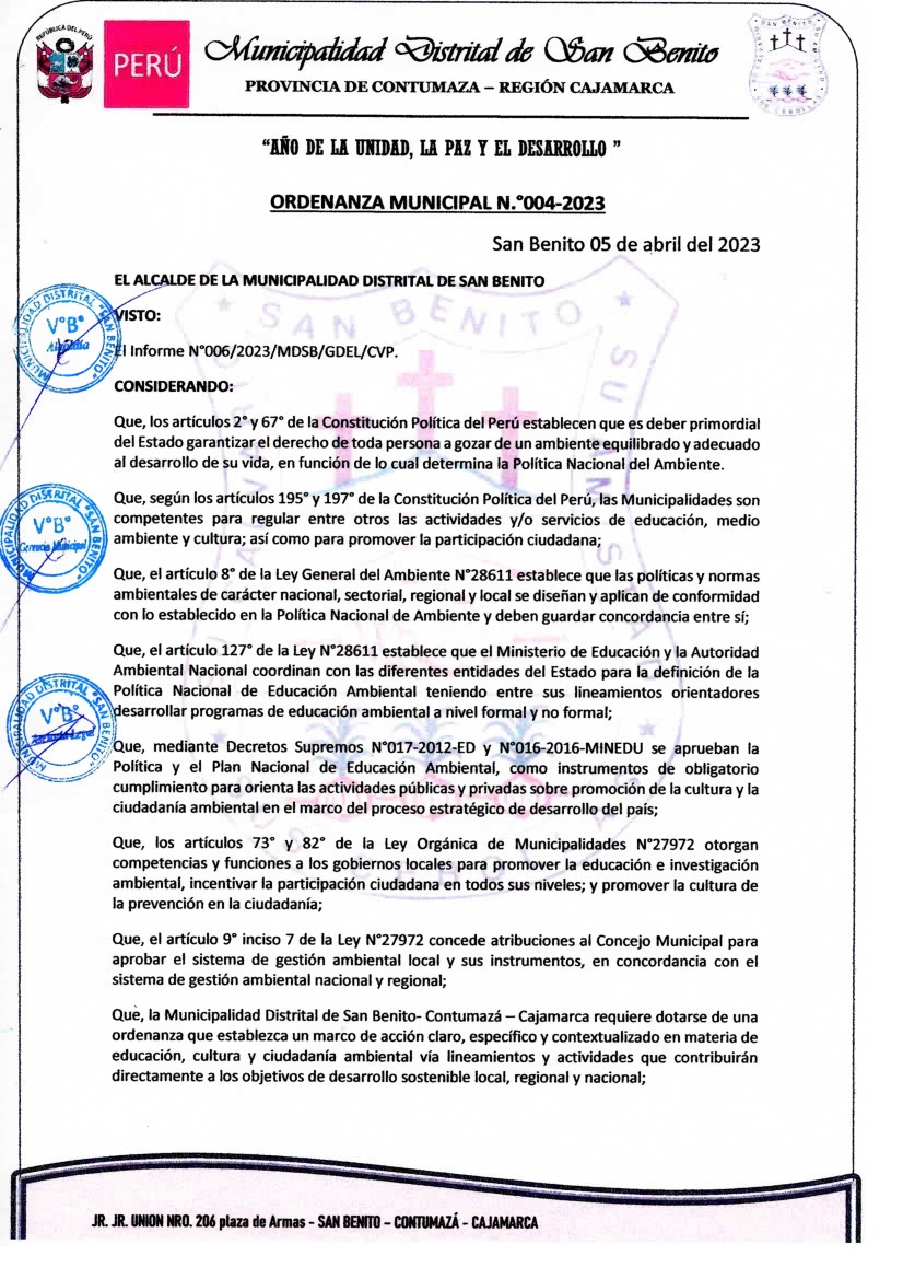 La presente Ordenanza aprueba el Programa Municipal de Educación, Cultura y Ciudadanía Ambiental de la Municipalidad Distrital de San Benito - Contumazá (Cajamarca); con la finalidad de promover la cultura y la educación ambiental para la formación de ciudadanas y ciudadanos ambientalmente responsables e incentivar la participación ciudadana en todos sus niveles.