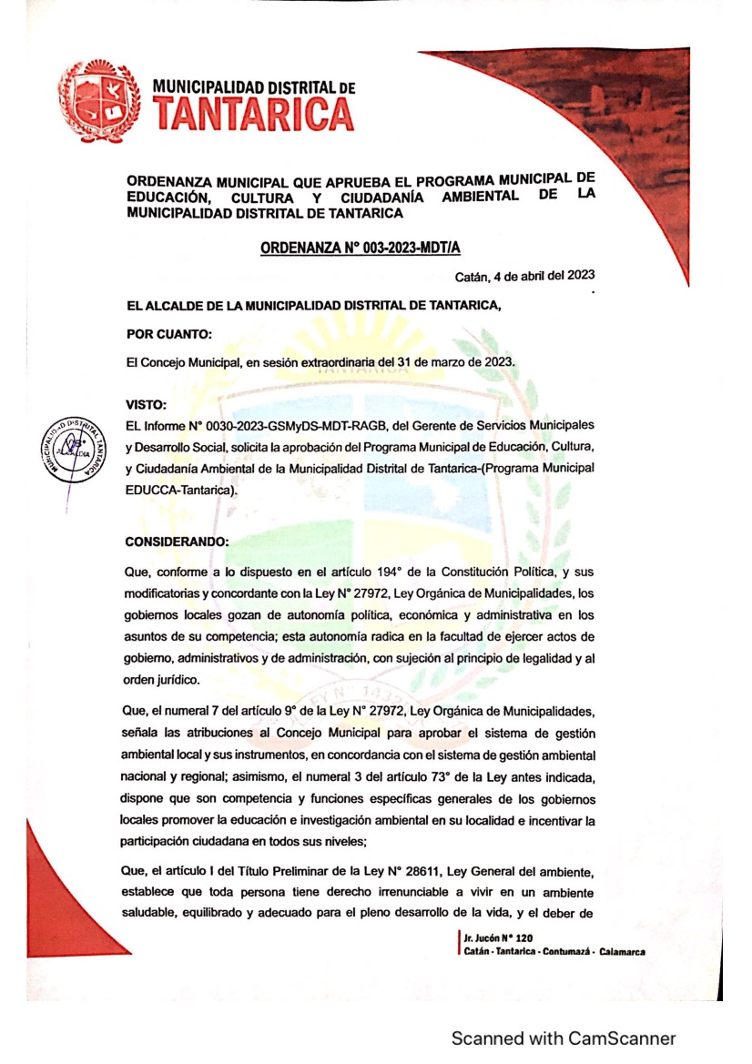 La presente Ordenanza aprueba el Programa Municipal de Educación, Cultura y Ciudadanía Ambiental de la Municipalidad Distrital de Tantarica - Contumazá (Cajamarca); con la finalidad de promover la cultura y la educación ambiental para la formación de ciudadanas y ciudadanos ambientalmente responsables e incentivar la participación ciudadana en todos sus niveles.