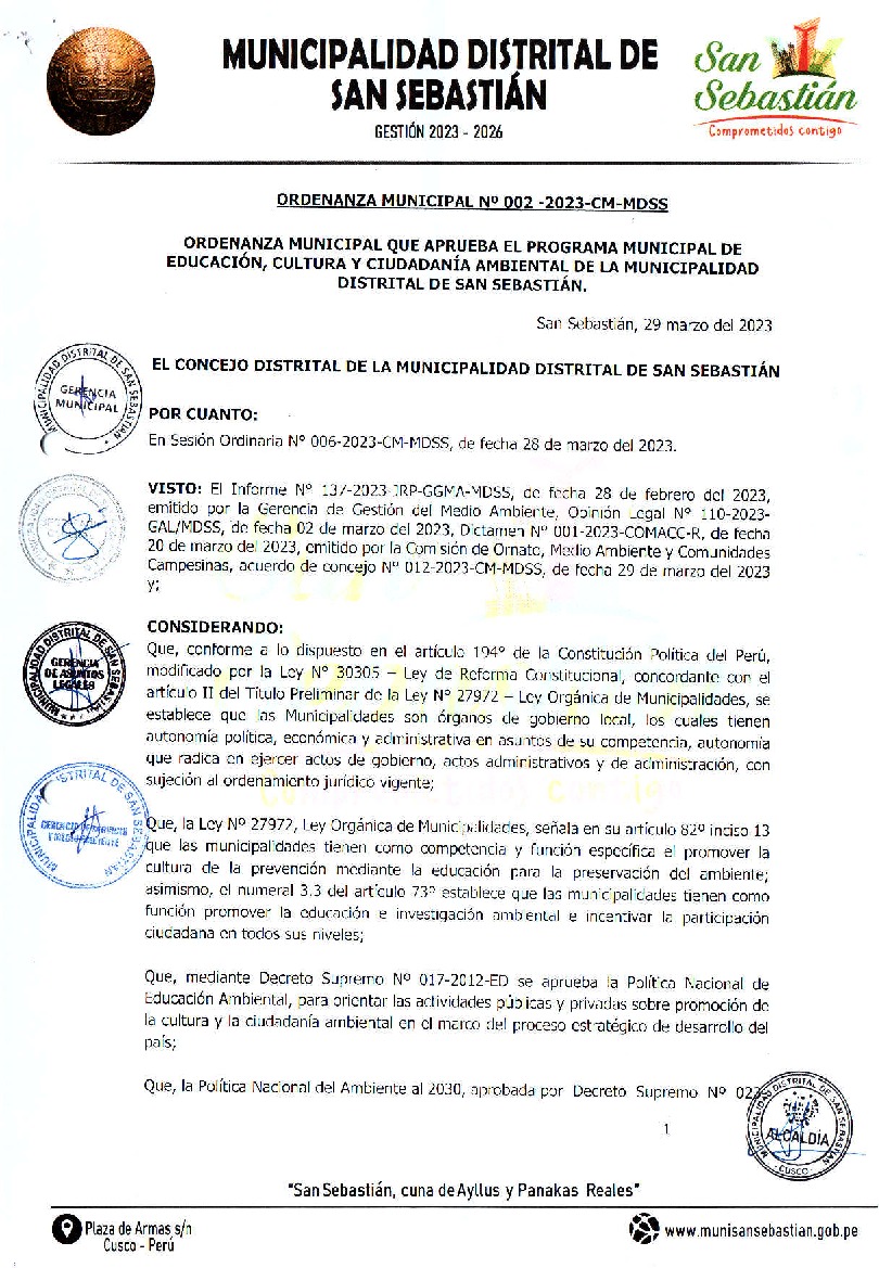 Programa Municipal de Educación, Cultura y Ciudadanía Ambiental de la Municipalidad Distrital de San Sebastián, Cusco (Cusco)
