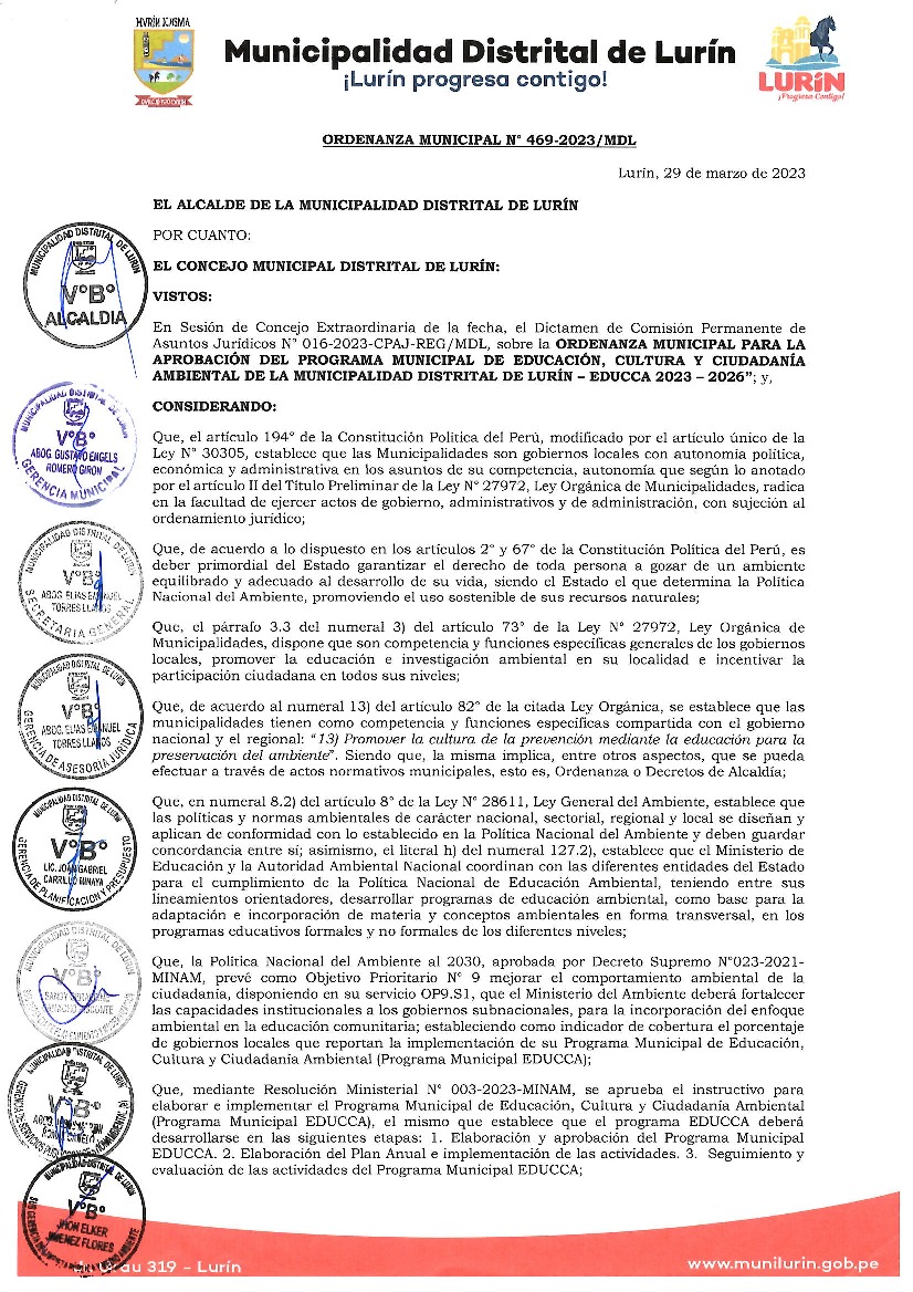 La presente Ordenanza aprueba el Programa Municipal de Educación, Cultura y Ciudadanía Ambiental de la Municipalidad Distrital de Lurín (Lima Metropolitana), con la finalidad de promover la cultura y la educación ambiental para la formación de ciudadanas y ciudadanos ambientalmente responsables e incentivar la participación ciudadana en todos sus niveles.