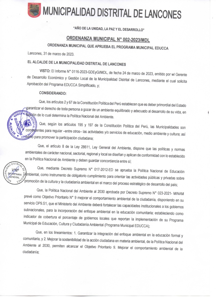 La presente Ordenanza aprueba el Programa Municipal de Educación, Cultura y Ciudadanía Ambiental de la Municipalidad Distrital de Lancones - Sullana (Piura); con la finalidad de promover la cultura y la educación ambiental para la formación de ciudadanas y ciudadanos ambientalmente responsables e incentivar la participación ciudadana en todos sus niveles.