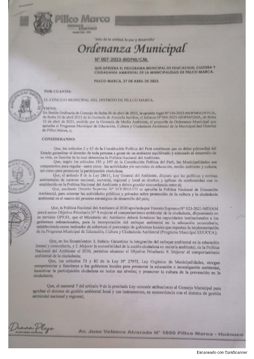 La presente Ordenanza aprueba el Programa Municipal de Educación, Cultura y Ciudadanía Ambiental de la Municipalidad Distrital de Pillco marca - Huánuco (Huánuco); con la finalidad de promover la cultura y la educación ambiental para la formación de ciudadanas y ciudadanos ambientalmente responsables e incentivar la participación ciudadana en todos sus niveles.