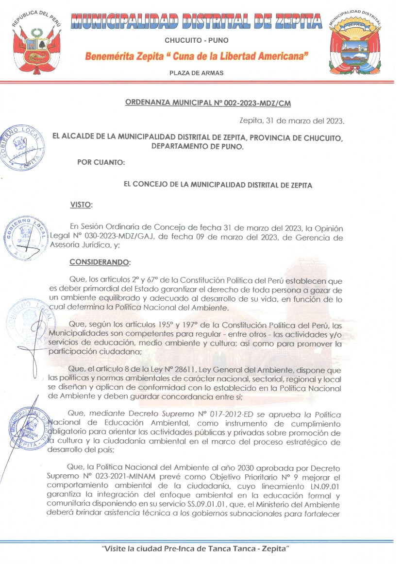 La presente Ordenanza Municipal aprueba el Programa Municipal de Educación, Cultura y Ciudadanía Ambiental de la Municipalidad Distrital de Zepita, con la finalidad de promover la cultura y la educación ambiental para la formación de ciudadanas y ciudadanos ambientalmente responsables e incentivar la participación ciudadana en todos sus niveles.