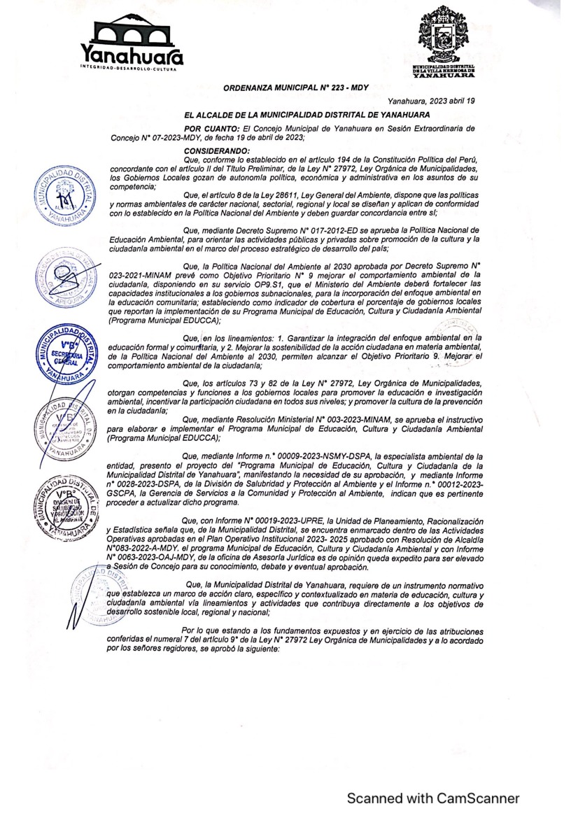 La presente Ordenanza aprueba el Programa Municipal de Educación, Cultura y Ciudadanía Ambiental de la Municipalidad Distrital de Yanahuara - Arequipa (Arequipa), con la finalidad de promover la cultura y la educación ambiental para la formación de ciudadanas y ciudadanos ambientalmente responsables e incentivar la participación ciudadana en todos sus niveles.