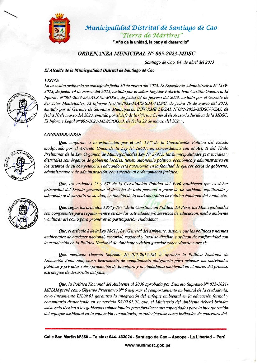 La presente Ordenanza aprueba el Programa Municipal de Educación, Cultura y Ciudadanía Ambiental de la Municipalidad Distrital de Santiago de Cao - Ascope (La Libertad); con la finalidad de promover la cultura y la educación ambiental para la formación de ciudadanas y ciudadanos ambientalmente responsables e incentivar la participación ciudadana en todos sus niveles.