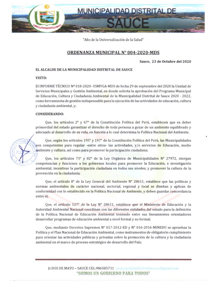 Programa Municipal de Educación, Cultura y Ciudadanía Ambiental de la Municipalidad Distrital de Sauce 2020 - 2022