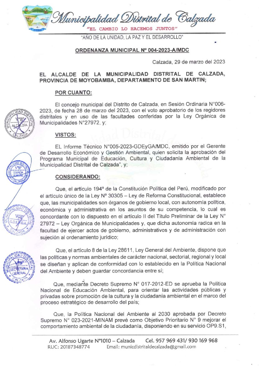 La presente Ordenanza aprueba el Programa Municipal de Educación, Cultura y Ciudadanía Ambiental de la Municipalidad Distrital de Calzada - Moyobamba (San Martín); con la finalidad de promover la cultura y la educación ambiental para la formación de ciudadanas y ciudadanos ambientalmente responsables e incentivar la participación ciudadana en todos sus niveles.