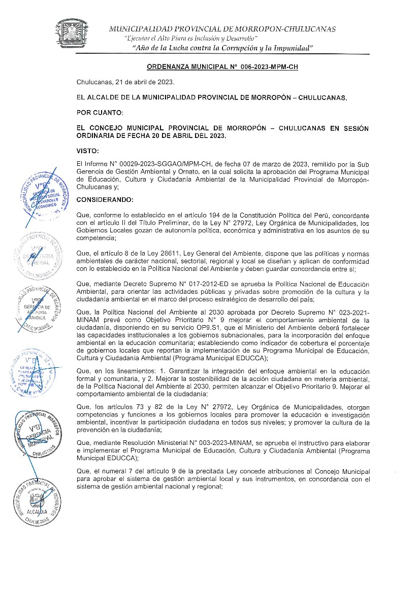 La presente Ordenanza aprueba el Programa Municipal de Educación, Cultura y Ciudadanía Ambiental de la Municipalidad Provincial de Morropón - Morropón (Piura); con la finalidad de promover la cultura y la educación ambiental para la formación de ciudadanas y ciudadanos ambientalmente responsables e incentivar la participación ciudadana en todos sus niveles.