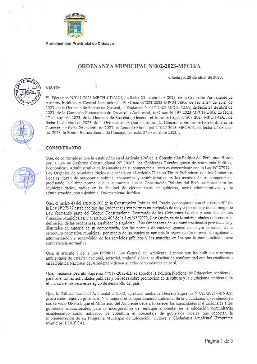 La presente Ordenanza aprueba el Programa Municipal de Educación, Cultura y Ciudadanía Ambiental de la Municipalidad Provincial de Chiclayo - Chiclayo (Lambayeque); con la finalidad de promover la cultura y la educación ambiental para la formación de ciudadanas y ciudadanos ambientalmente responsables e incentivar la participación ciudadana en todos sus niveles.
