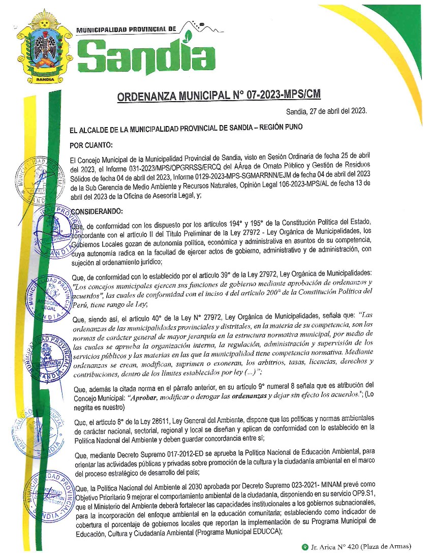 La presente Ordenanza Municipal aprueba el Programa Municipal de Educación, Cultura y Ciudadanía Ambiental de la Municipalidad Provincia de Sandía, con la finalidad de promover la cultura y la educación ambiental para la formación de ciudadanas y ciudadanos ambientalmente responsables e incentivar la participación ciudadana en todos sus niveles.