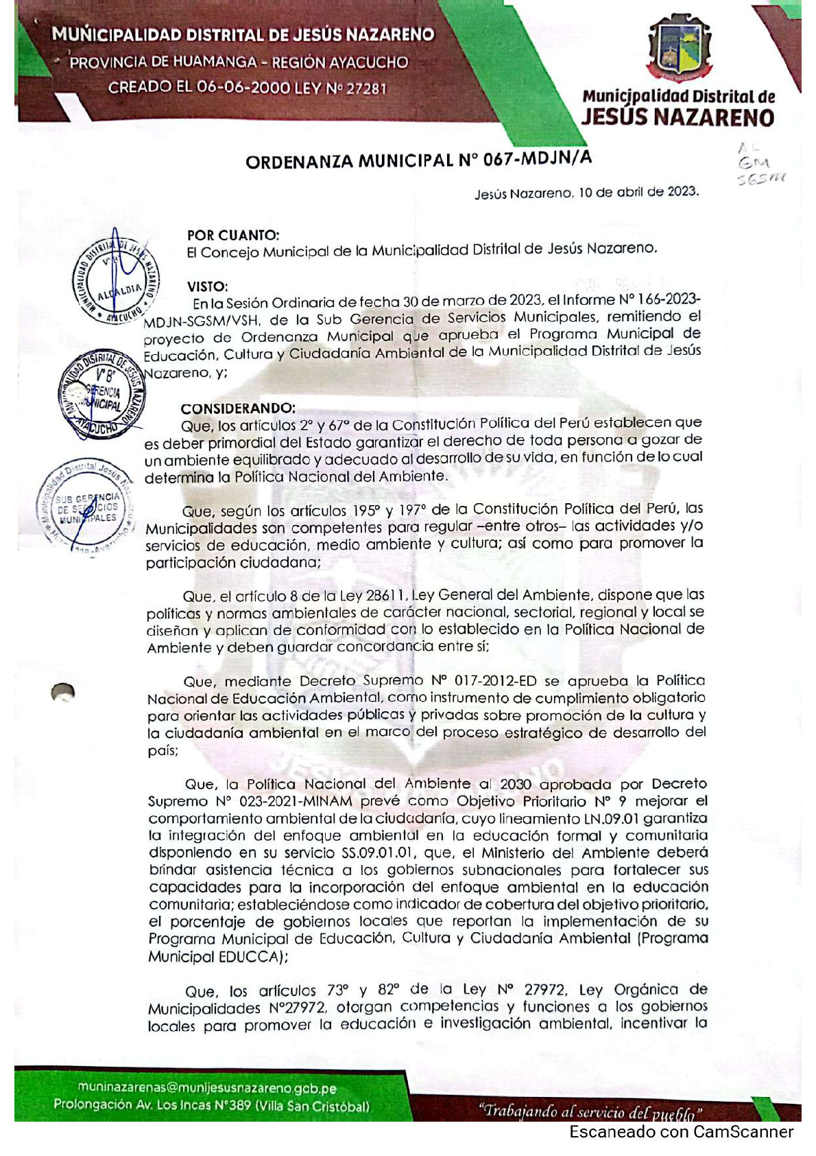 La presente Ordenanza aprueba el Programa Municipal de Educación, Cultura y Ciudadanía Ambiental de la Municipalidad Distrital de Jesús Nazareno-Huamanga (Ayacucho), con la finalidad de promover la cultura y la educación ambiental para la formación de ciudadanas y ciudadanos ambientalmente responsables e incentivar la