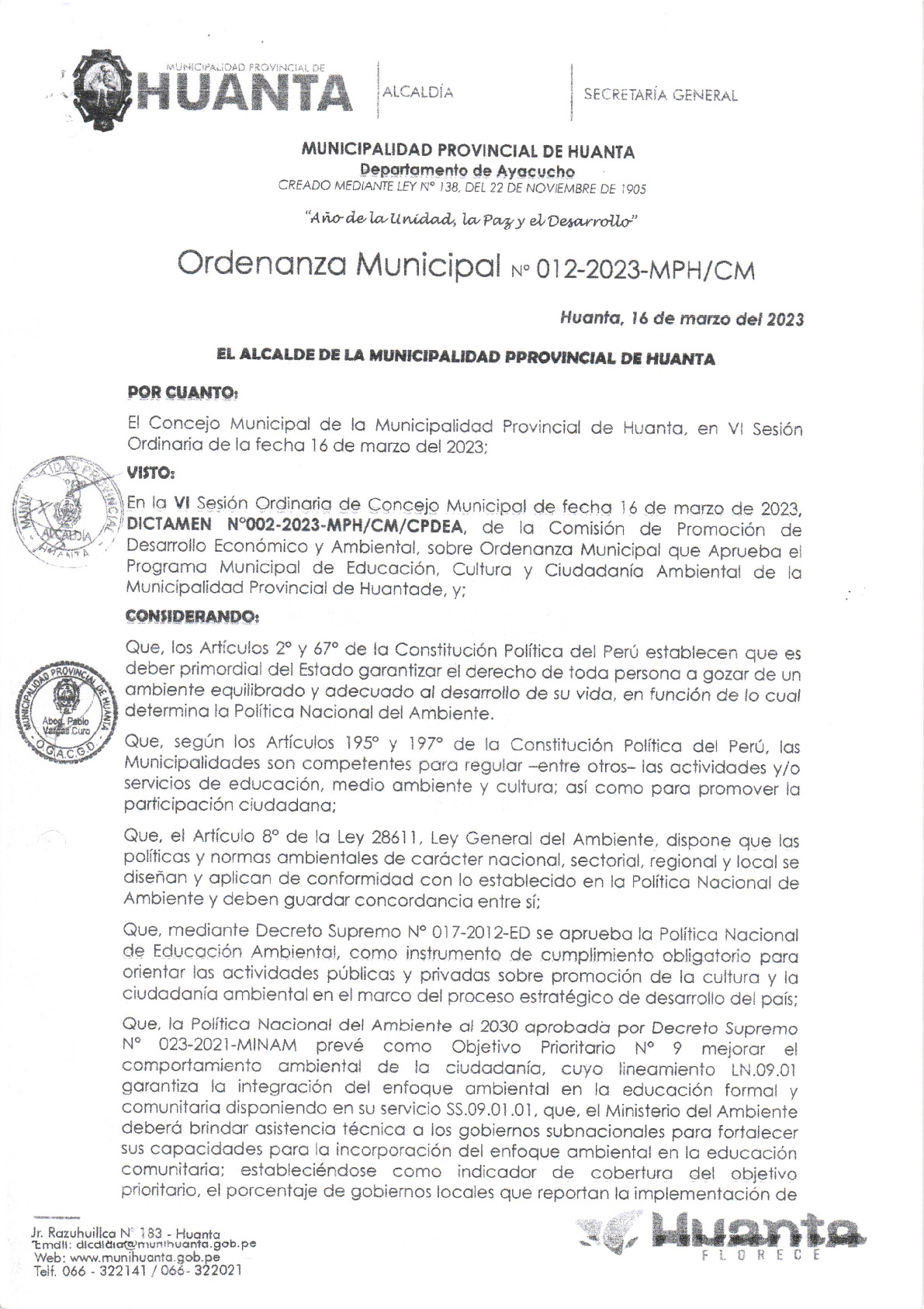 La presente Ordenanza aprueba el Programa Municipal de Educación, Cultura y Ciudadanía Ambiental de la Municipalidad Provincial de Huanta - Huanta (Ayacucho), con la finalidad de promover la cultura y la educación ambiental para la formación de ciudadanas y ciudadanos ambientalmente responsables e incentivar la
