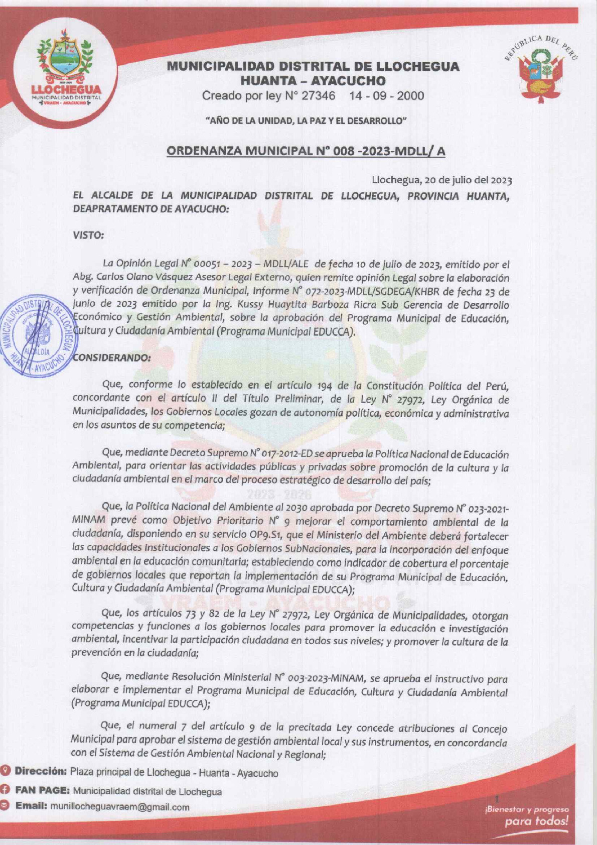 La presente Ordenanza aprueba el Programa Municipal de Educación, Cultura y Ciudadanía Ambiental de la Municipalidad Distrital de LLochegua-Huanta (Ayacucho), con la finalidad de promover la cultura y la educación ambiental para la formación de ciudadanas y ciudadanos ambientalmente responsables e incentivar la