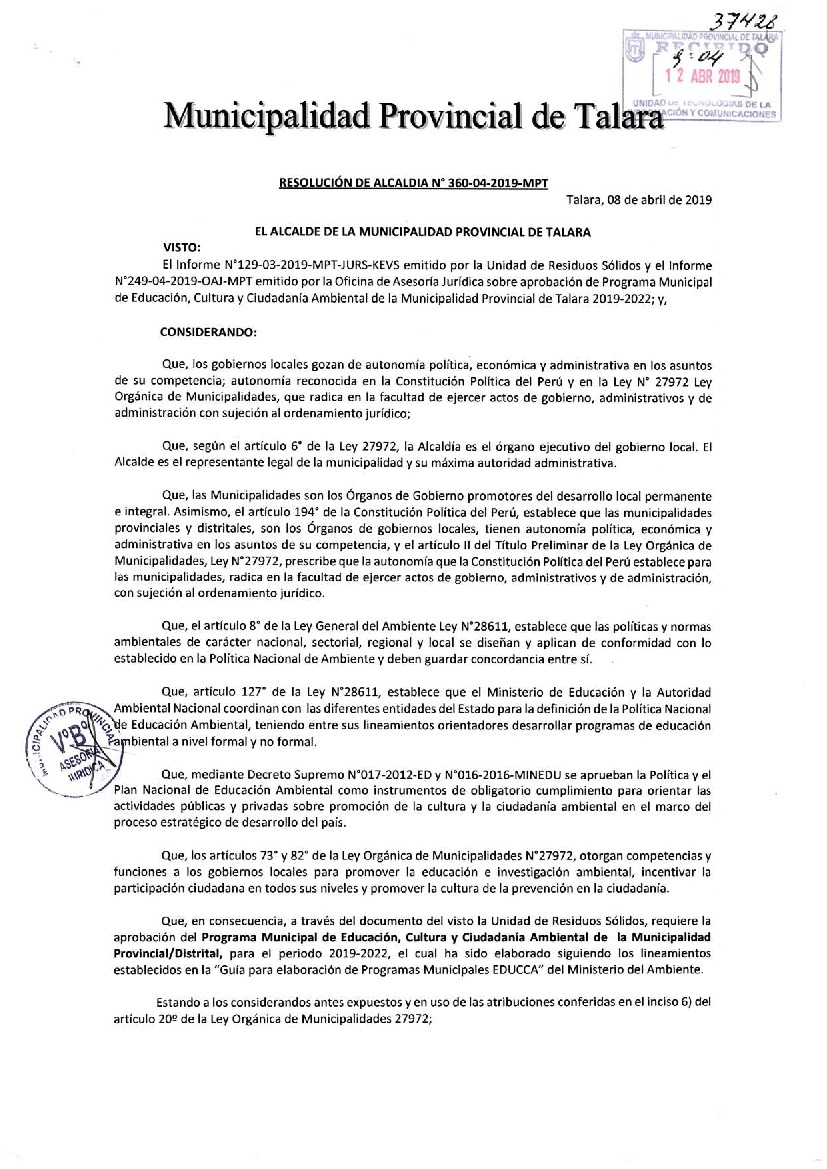 La presente Resolución aprueba el Programa Municipal de Educación, Cultura y Ciudadanía Ambiental de la Municipalidad Provincial de Talara, para el periodo 2019 - 2022; con la finalidad de promover la cultura y la educación ambiental para la formación de ciudadanas y ciudadanos ambientalmente responsables e incentivar la participación ciudadana en todos sus niveles.