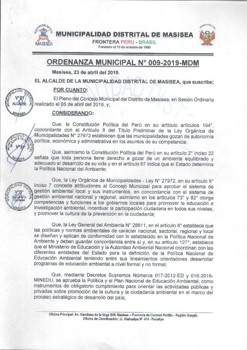 La presente Ordenanza aprueba el Programa Municipal de Educación, Cultura y Ciudadanía Ambiental de la Municipalidad Distrital de Masisea, para el periodo 2019 - 2022; con la finalidad de promover la cultura y la educación ambiental para la formación de ciudadanas y ciudadanos ambientalmente responsables e incentivar la participación ciudadana en todos sus niveles.