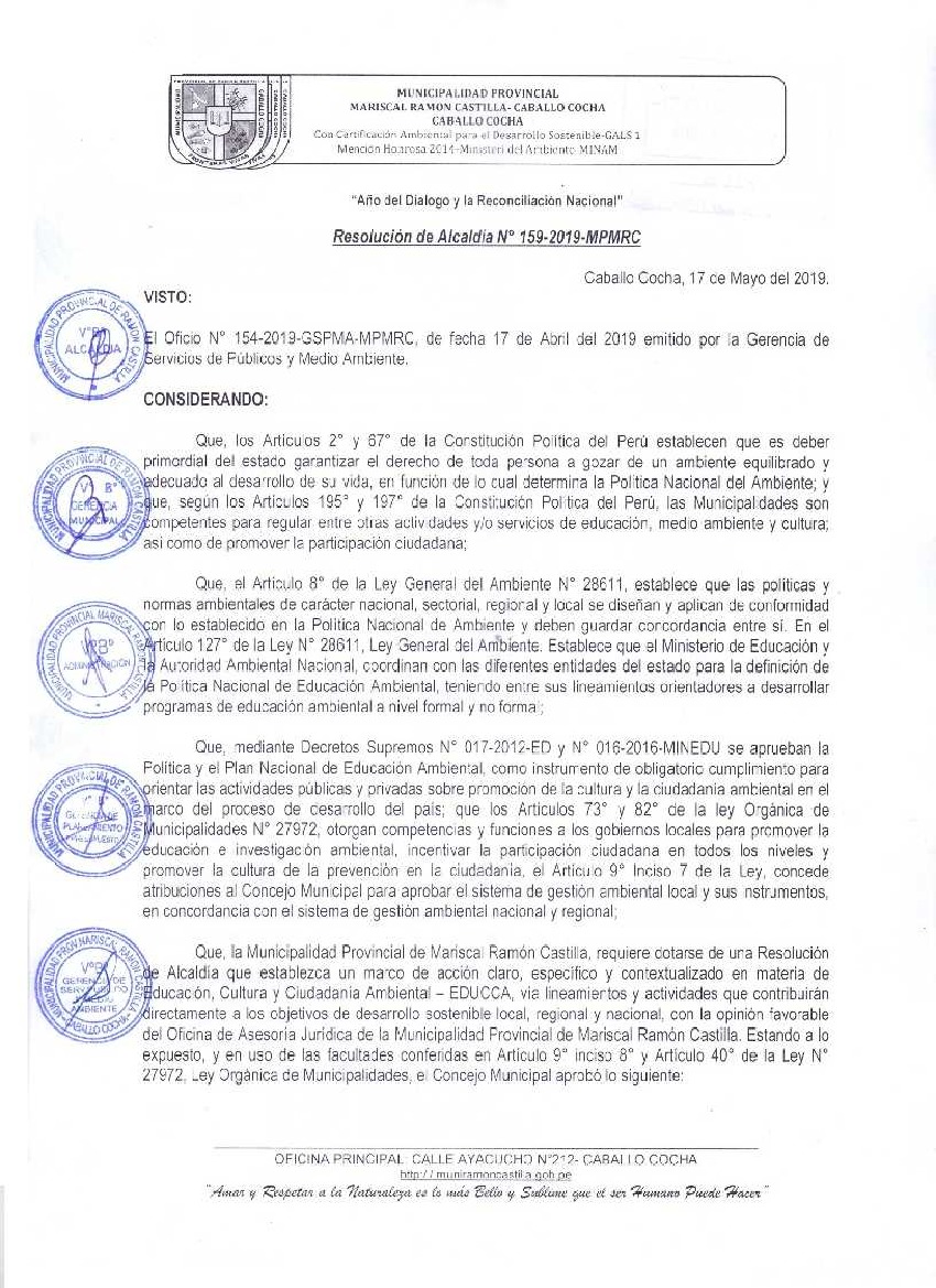La presente Resolución aprueba el Programa Municipal de Educación, Cultura y Ciudadanía Ambiental de la Municipalidad Provincial de Mariscal Ramón Castilla, para el periodo 2019 - 2022; con la finalidad de promover la cultura y la educación ambiental para la formación de ciudadanas y ciudadanos ambientalmente responsables e incentivar la participación ciudadana en todos sus niveles.