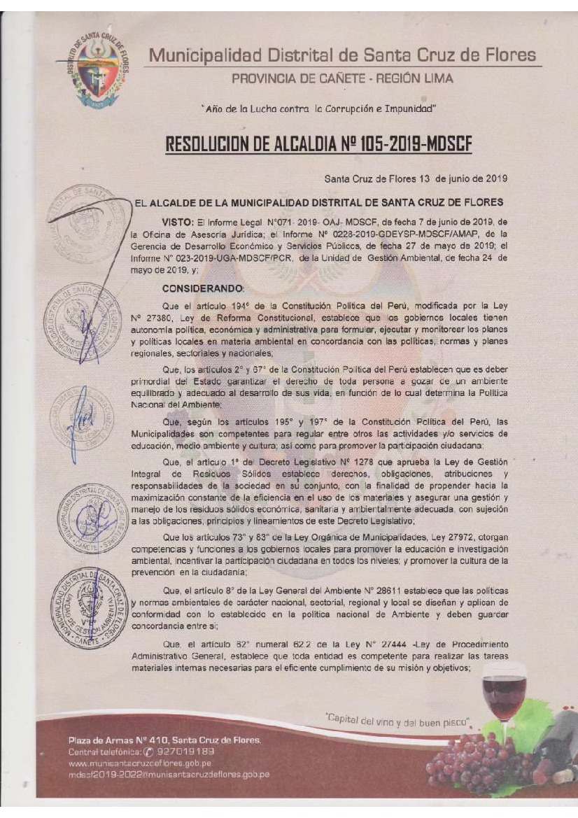 La presente Resolución de Alcaldía aprueba el Programa Municipal de Educación, Cultura y Ciudadanía Ambiental de la Municipalidad Distrital de Santa Cruz de Flores, distrito de la provincia de Cañte, para el periodo 2019 -2022; con la finalidad de promover la cultura y la educación ambiental para la formación de ciudadanas y ciudadanos ambientalmente responsables e incentivar la participación ciudadana en todos sus niveles.