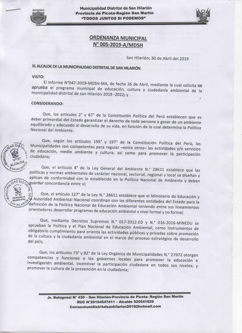 La presente Ordenanza aprueba el Programa Municipal de Educación, Cultura y Ciudadanía Ambiental de la Municipalidad Distrital de San Hilarión, para el periodo 2019 - 2022; con la finalidad de promover la cultura y la educación ambiental para la formación de ciudadanas y ciudadanos ambientalmente responsables e incentivar la participación ciudadana en todos sus niveles.
