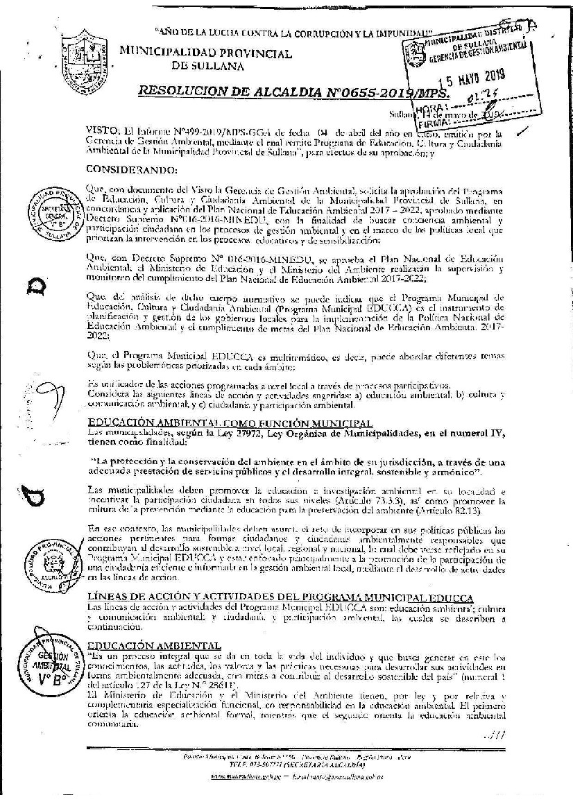 La presente Resolución aprueba el Programa Municipal de Educación, Cultura y Ciudadanía Ambiental de la Municipalidad Provincial de Sullana, para el periodo 2019 - 2022; con la finalidad de promover la cultura y la educación ambiental para la formación de ciudadanas y ciudadanos ambientalmente responsables e incentivar la participación ciudadana en todos sus niveles.
