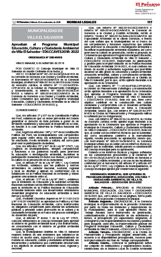 La presente Ordenanza aprueba el Programa Municipal de Educación, Cultura y Ciudadanía Ambiental de la Municipalidad Distrital de Villa El Salvador, para el periodo 2018 - 2022; con la finalidad de promover la cultura y la educación ambiental para la formación de ciudadanas y ciudadanos ambientalmente responsables e incentivar la participación ciudadana en todos sus niveles.