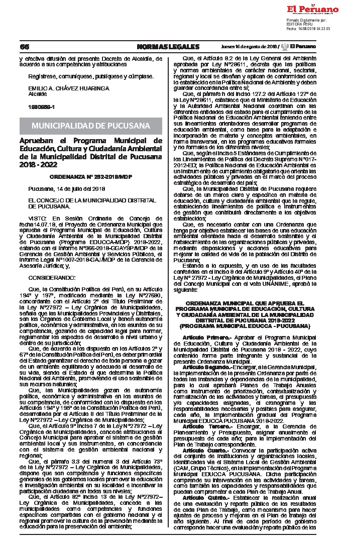 La presente Ordenanza aprueba el Programa Municipal de Educación, Cultura y Ciudadanía Ambiental de la Municipalidad Distrital de Pucusana, para el periodo 2018 - 2022; con la finalidad de promover la cultura y la educación ambiental para la formación de ciudadanas y ciudadanos ambientalmente responsables e incentivar la participación ciudadana en todos sus niveles.